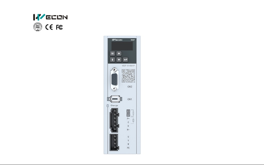 The WECON VD2F series consists of compact, pulse-type servo drives designed for general-purpose industrial positioning applications. They are part of the VD2 SA series of servo drives, known for being affordable, versatile, and offering high-performance features for motion control in machinery like robotics and conveyors.