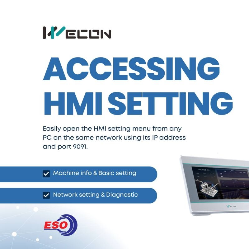 Wecon HMI settings are accessed through the PIStudio software for configuration or via a web browser using the HMI's IP address for network/system monitoring. Key settings include setting static IPs, configuring V-NET cloud monitoring, managing user permissions, and accessing system, user, and recipe registers.